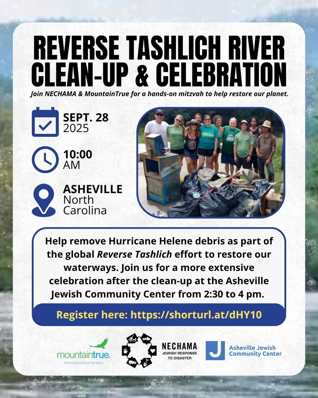 Join members of CJJ-West as we gather to meet and great and commemorate the one-year anniversary of Hurricane Helene. We'll drink coffee, have some pastries, sing, share stories, and get to know each other better before working together. Let's take some time for reflection and Jewish joy, before we take tangible steps to clean our waterways post-Helene.
